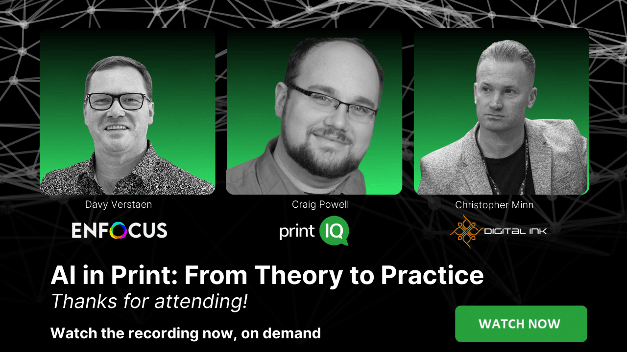 The energy was amazing – questions were flowing, the chat was buzzing, and once again it proved just how much momentum there is around AI in print. Huge thanks to our hosts Craig C. Powell from printIQ and Davy Verstaen from Enfocus and to Christopher Minn from Digital Ink for keeping the conversation practical, insightful, and focused on real-world workflows.